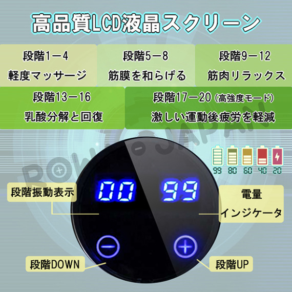 ■ 20段階振動調整:高品質LCD液晶スクリーンのコントロール、低速から高速まで、20段階の振動モード自由に調節することができます。
